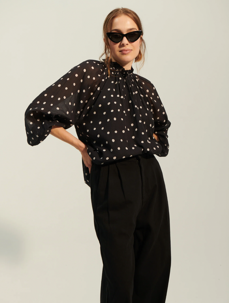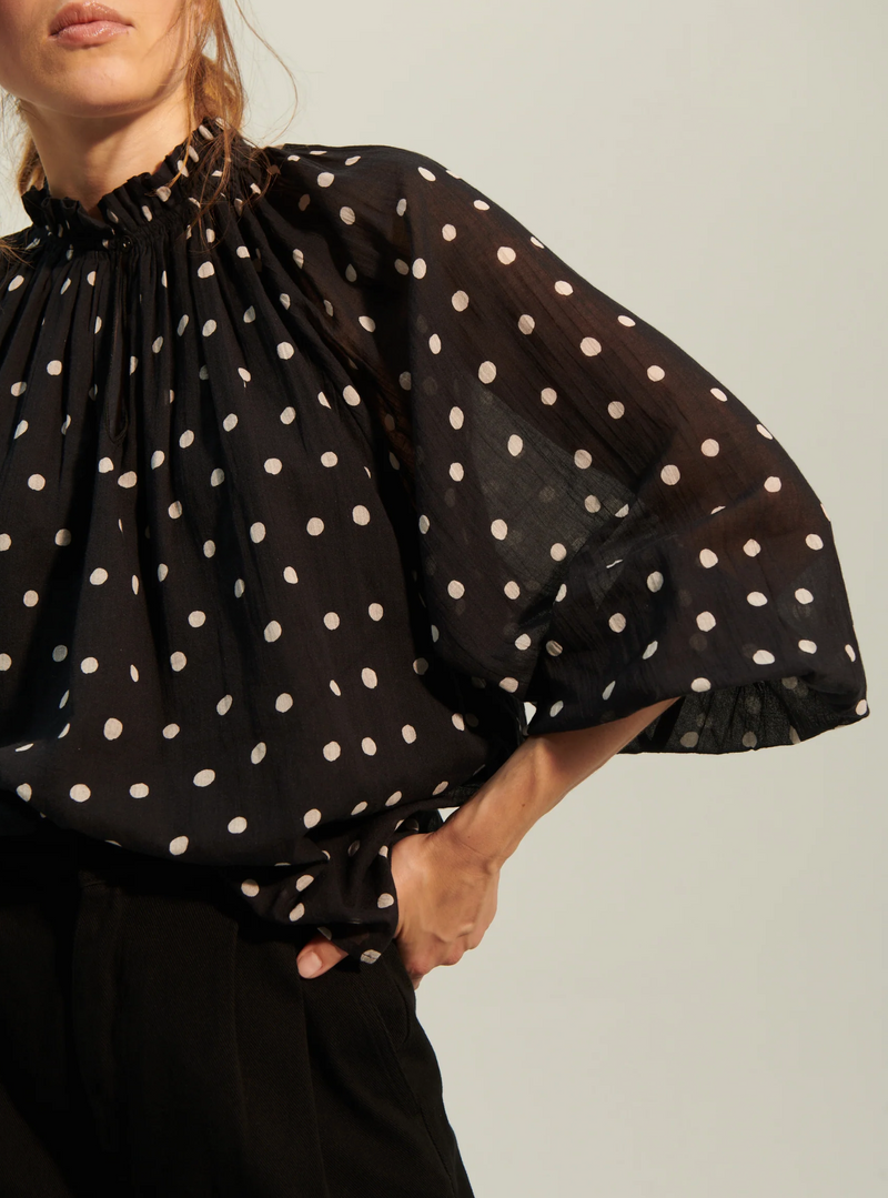 Camicia nera con pois ecru con maniche raglan e collo elastico con mini volants.