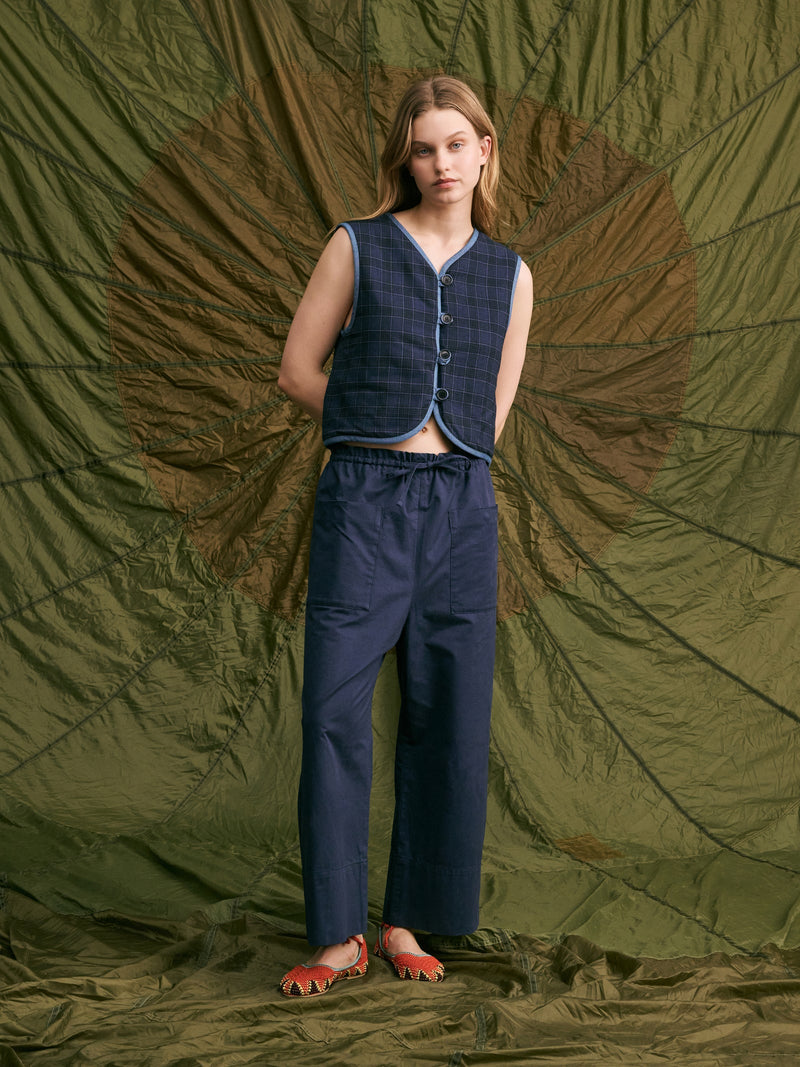 Gilet scollo a V con abbottonatura frontale e profili in denim.